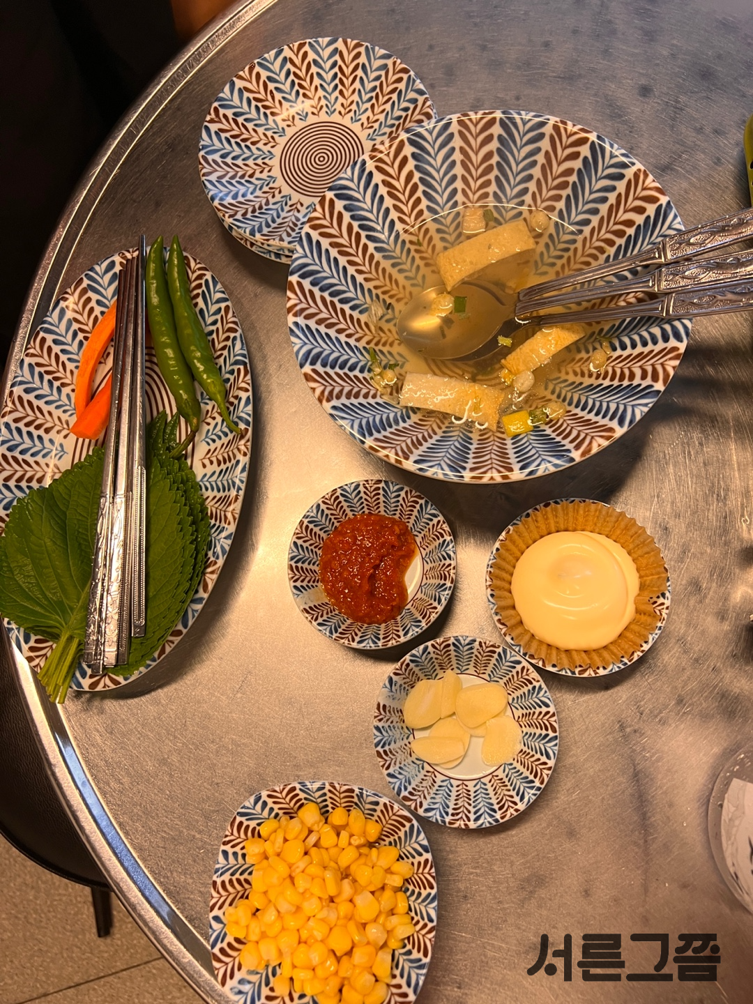기본 상차림입니다. 콘옥수수랑 어묵탕, 마요네즈가 나옵니다.